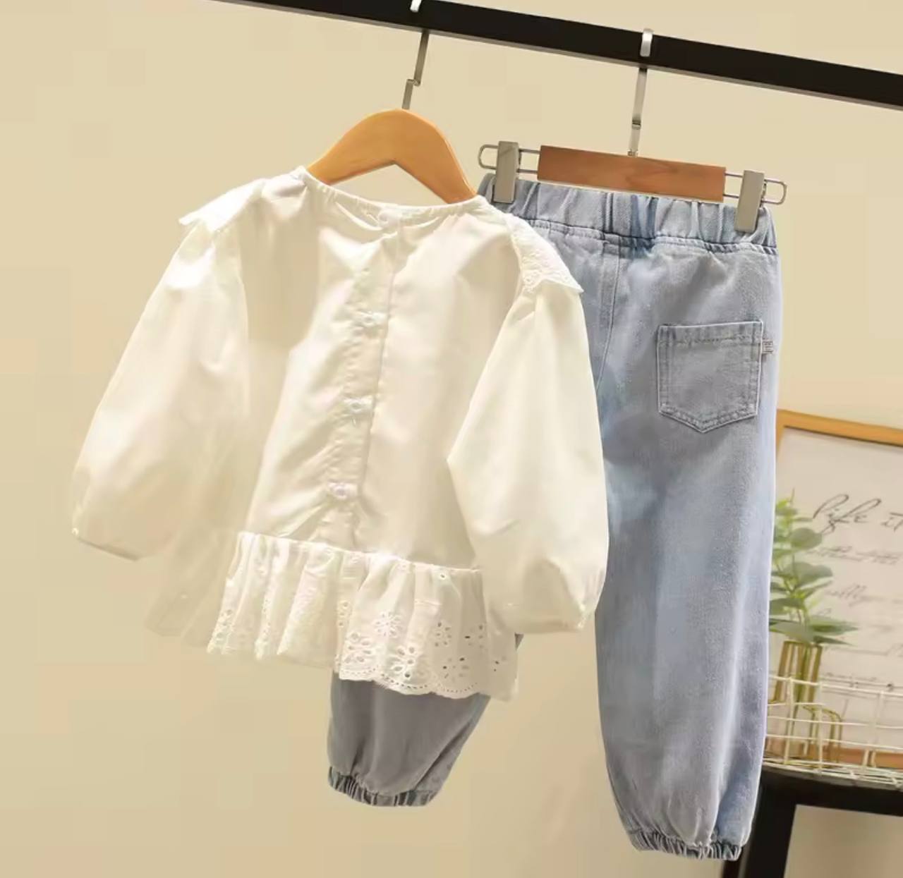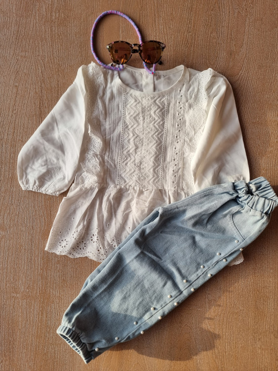 شومیز خامه دوزی و شلوار جین نگین دار دخترانه جذاب مناسب مهمانی و دورهمی محصول وارداتی