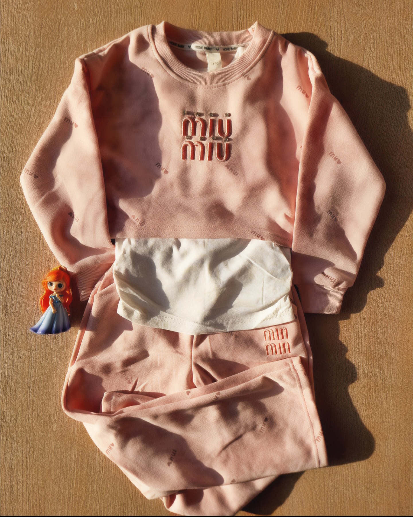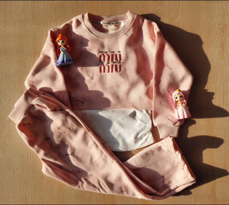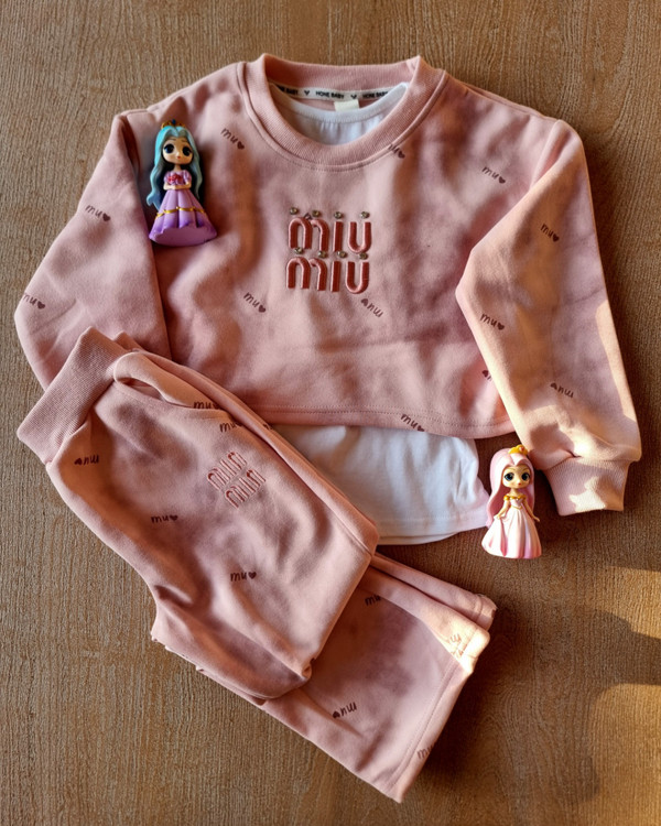 ست سه تکه دخترانه شامل تاپ آستین حلقه ای و رویه صورتی و شلوار راسته
